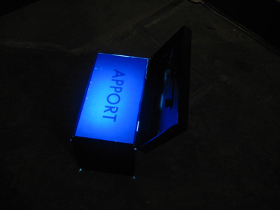 The light box was built for the Apport exhibition at The Lost Soul and Stranger Service Station in 2009. The object, a black metal box suitcase, contains the title of the exhibition.